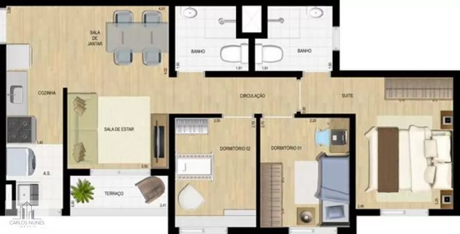 Apto com 56m², 3 dormitórios (sendo 1 suite), cozinha(com armários planejados), sala(2 ambientes com sanca), varanda, lavanderia,banheiro e 1 vaga de garagem. Todo em piso laminado.